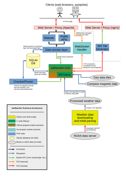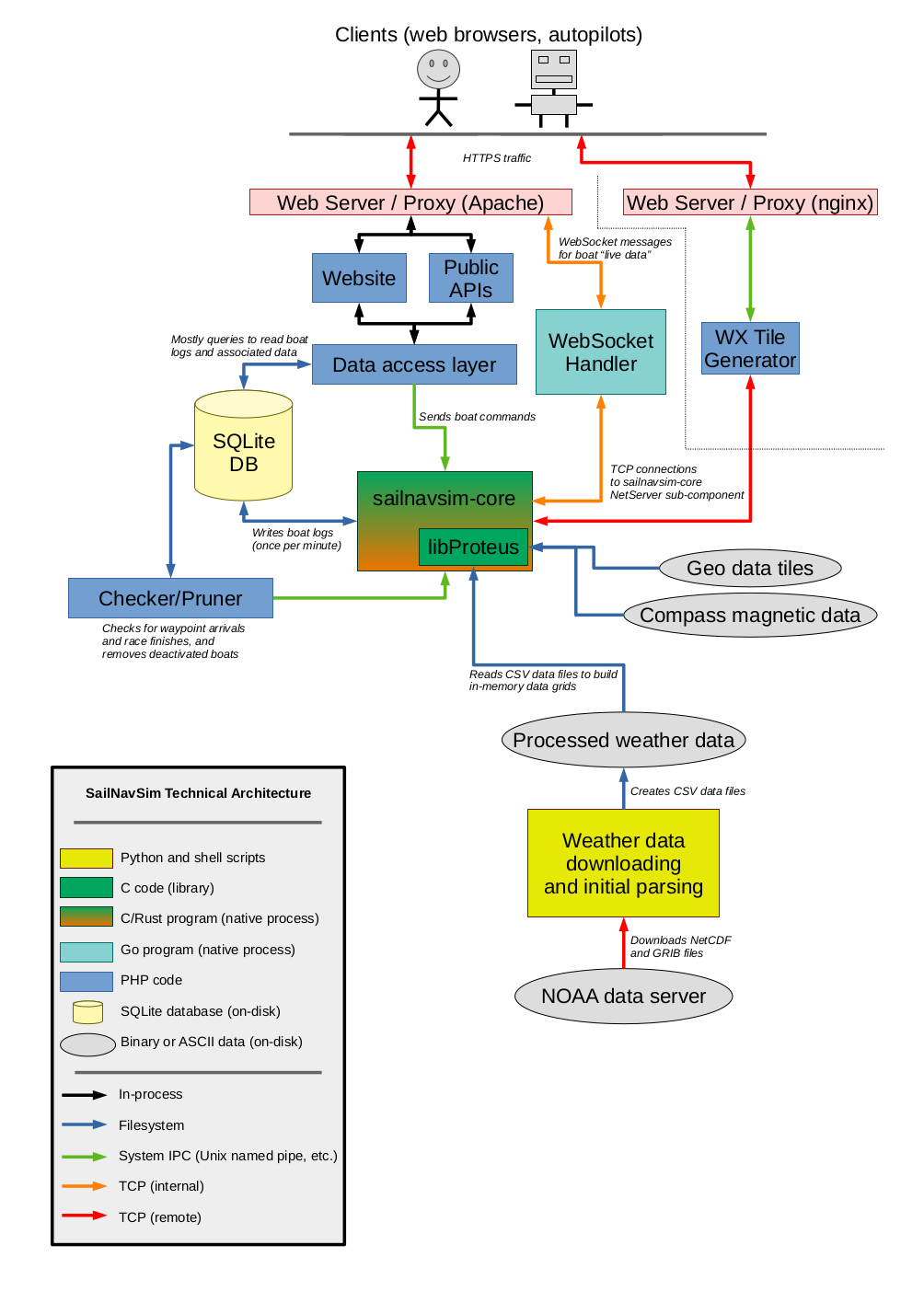 The entirety of the SailNavSim site with its constituent components is at present hosted on two VPS machines. The two exceptions to this are the race map's base geographic tile images and the Windy weather map (when requested to be shown). There is plenty of latitude to scale both vertically and horizontally should future demand benefit from it.